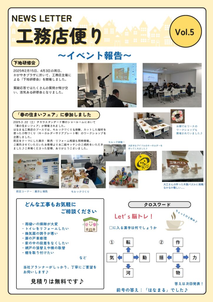 はなまる工務店便りVol.5 2025 4/15 お知らせ はなまる工務店 工務店通信 2025年4月15日 こんにちは♪工務店便りを更新しました。 ダウンロードしたい方はこちら お知らせ はなまる工務店 工務店通信 関連記事 【報告】11/26 つながる未来展 2025 開催しました 2025年12月1日 【11/26(水)】つながる未来展 2025 福祉×防災×防犯のご案内 2025年10月8日 イチオシ商品 室内干しハンガーバーの紹介 2025年6月18日 2025/3/22(土)はなまる工務店×タカラスタンダードイベント 春の住まいフェア開催のお知らせ♪ 2025年3月8日 はなまる工務店通信 創刊号(VOL.1) 2025年2月4日 お知らせ 2025年1月29日 はなまる工務店通信Vol.4 2025年1月23日 はなまる工務店通信VOL.3 2024年12月6日